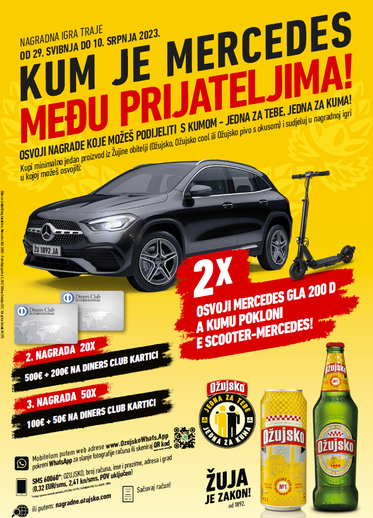 When we have very valuable prizes (2 x Mercedes GLA 200D + escooter worth €46,827.61 => total €93,655.22) and the best-selling beer on the market (Ožujsko), the success of the prize draw is guaranteed. The total prize pool was €115,155.22. Regarding the prize game that works to popularize the brand, this was one of the most successful prize games in history and according to the number of sales during its holding, every fiftieth inhabitant of the Republic of Croatia bought at least one Ožujsko beer.